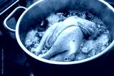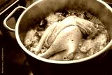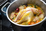 Chicken soup with vegetables and spices is boiling in a pot, cooking a healthy broth, home remedy against cold and flu, selected focus
