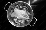 Ingredients for a healthy soup with a whole chicken and vegetables in a stainless-steel pot on the black stove, cooking for the immune system against cold and flu, top view from above, copy space