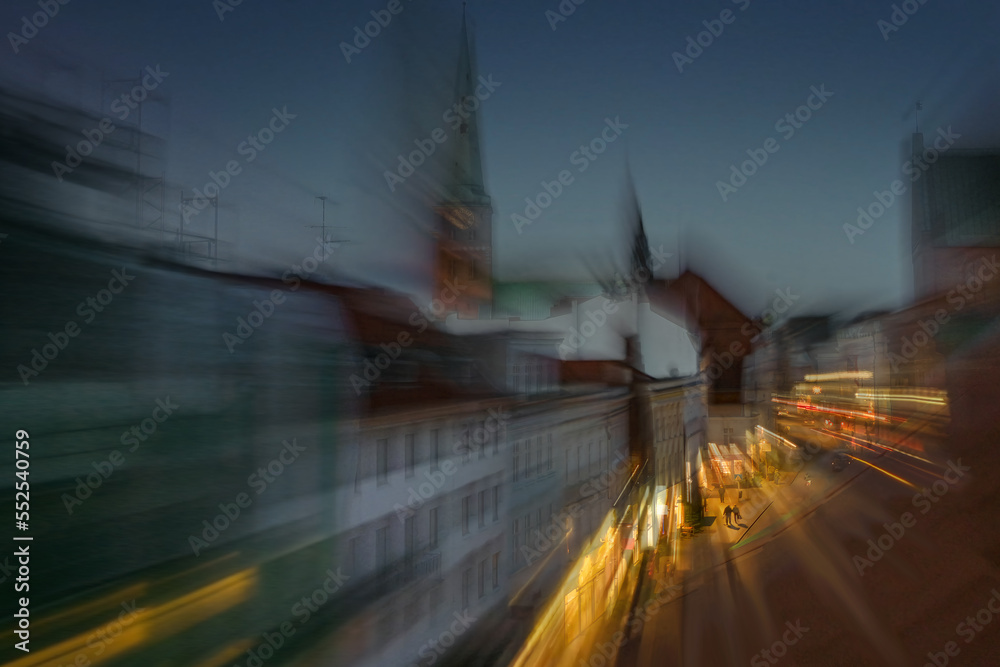 Just before closing time in Lübeck, people go shopping in the illuminated street, while the city already disappears in the coming night, multiple long and short exposure, abstract art image