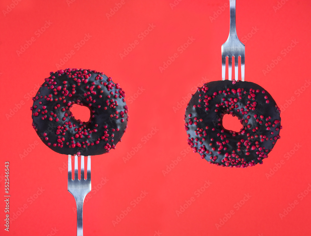 Donut with black glaze impaled on a silver fork on the red background. Close-up.