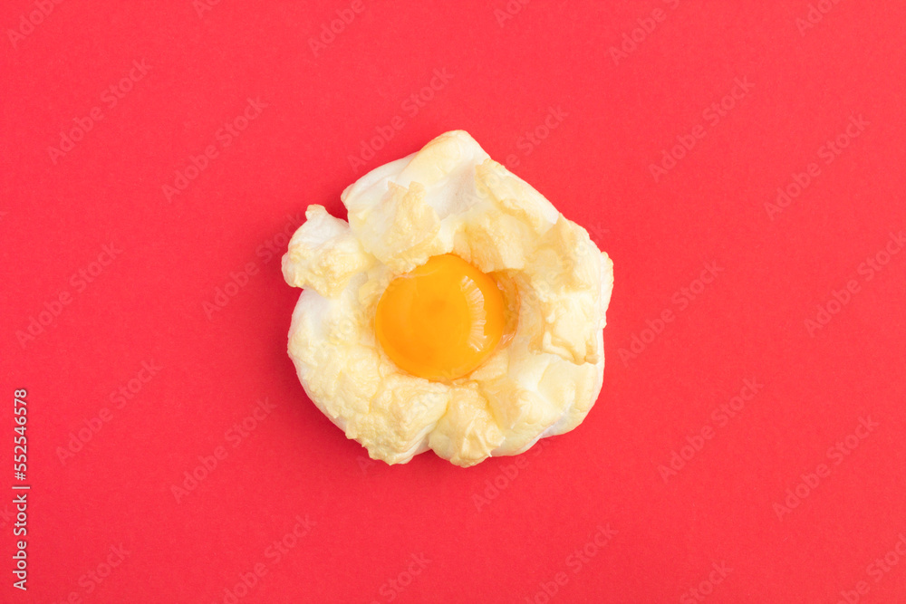 Egg in the cloud in the center of the red background. Top view. Close-up.