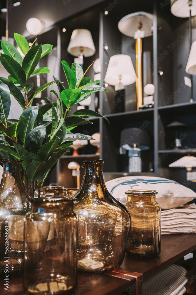 View of assortment of decor for interior shop in store of shopping center. Home accessories and household products for living room in store of shopping centre. View of decorative glass vessels on
