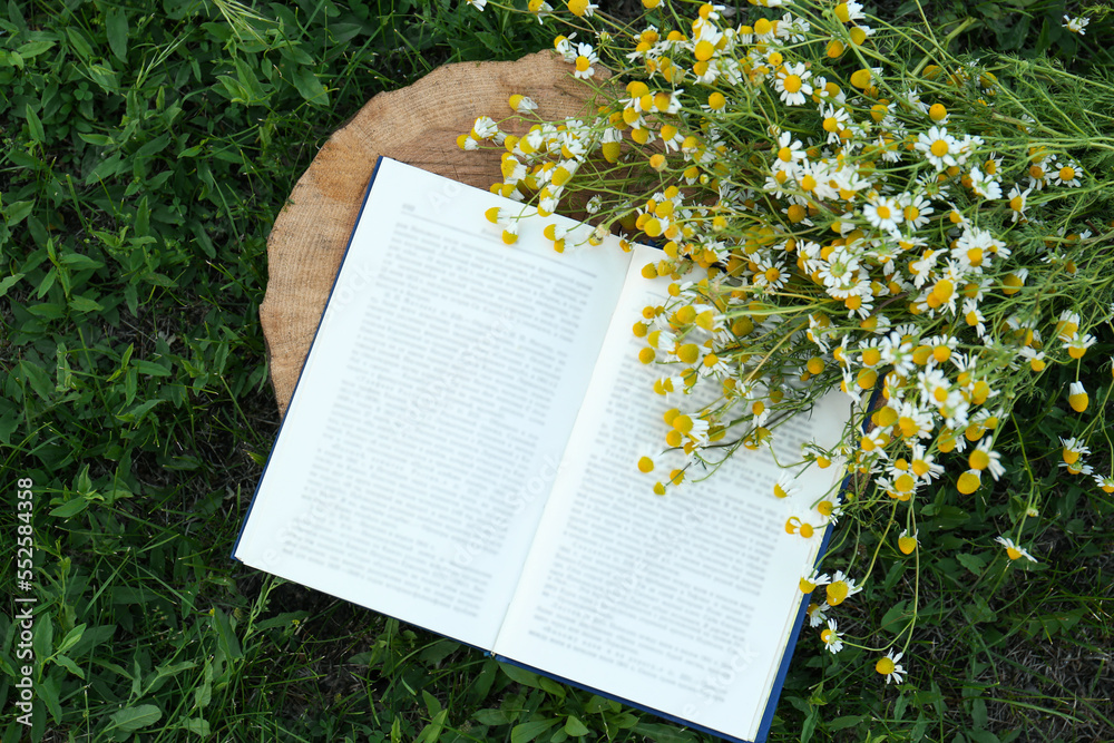 Open book and chamomiles on wooden stump outdoors, flat lay