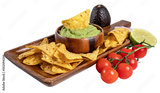 A wooden board with guacamole sauce, nachos and ingredients