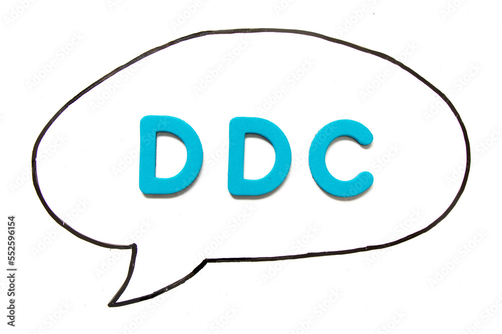 Alphabet letter with word DDC in black line hand drawing as bubble speech on white board background