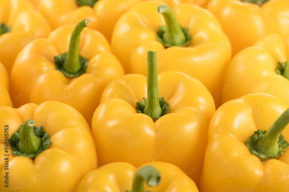 Yellow bell peppers background, vegan, vegetable backdrop. Fresh sweet organic bell pepper close up, backdrop