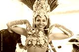 Festival, carnival and portrait of samba dancer dancing for performance, festive celebration or party in Brazil. Mardi gras event, culture and happy woman dance in costume at concert with music band.