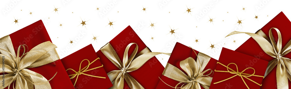red gift boxes with bright golden ribbon bow isolated on transparent background with golden stars, gift greeting card top view or label for christmas or valentine day, template for banner