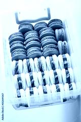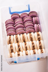 Pink and white macarons cookies in the box. Isolated on white background. Tasty dessert