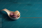 Tasty almond macarons on the blue wood surface. Vintage, romantic style