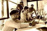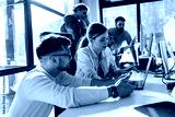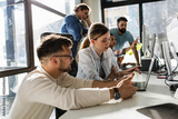 Group of team workers and game developers starting a new project. Senior programmer giving help to beginner.