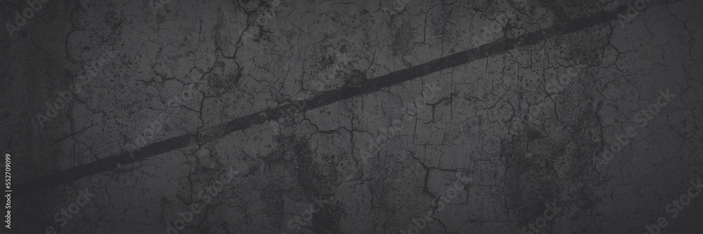 Dark wide panoramic background. Peeling paint on a concrete wall. Faded dark texture of old cracked flaking paint. Weathered rough painted surface with patterns of cracks. Shaded background for design