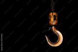 Crane hook. The system of pulleys and ropes. Close up crane hook for overhead crane. Isolated on black background.