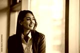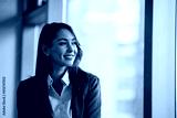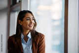 Portrait of young happy businesswoman in office looking away.