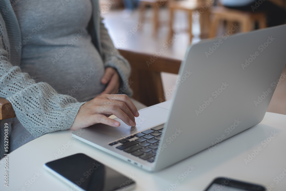 Pregnant woman working on laptop. Cropped image of pregnant businesswoman sitting at table typing on laptop at her working place in office