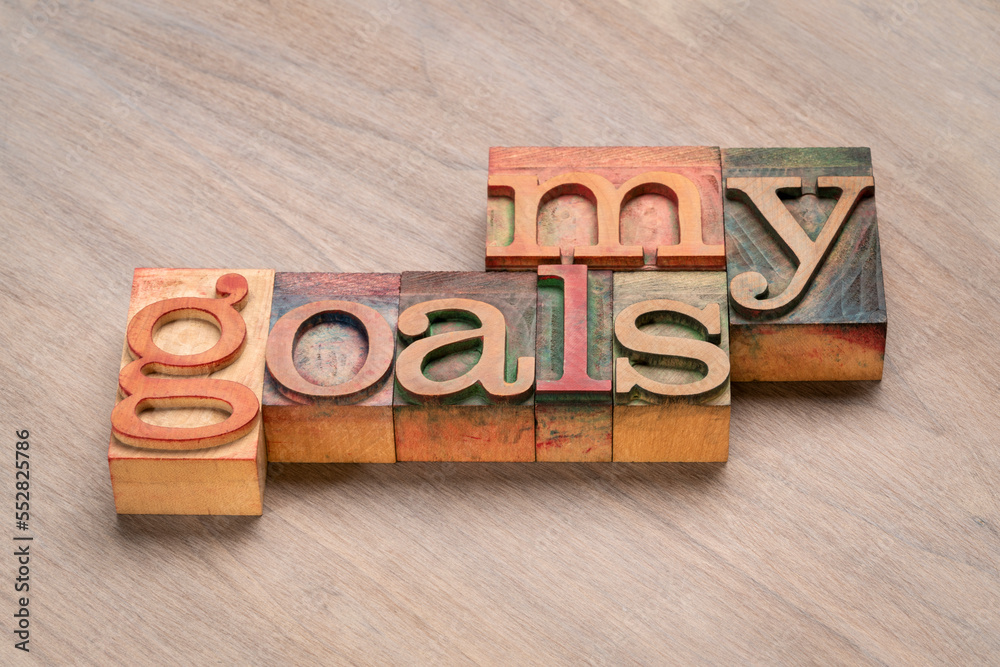 my goals - word abstract in letterpress wood type against grained wooden background, goal setting concept