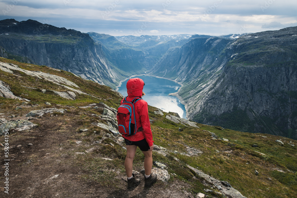 Young tourist woman in red jacket watching the view on the beautiful Ringedalsvatnet Lake. Hiking in Norwegian nature in windy weather.