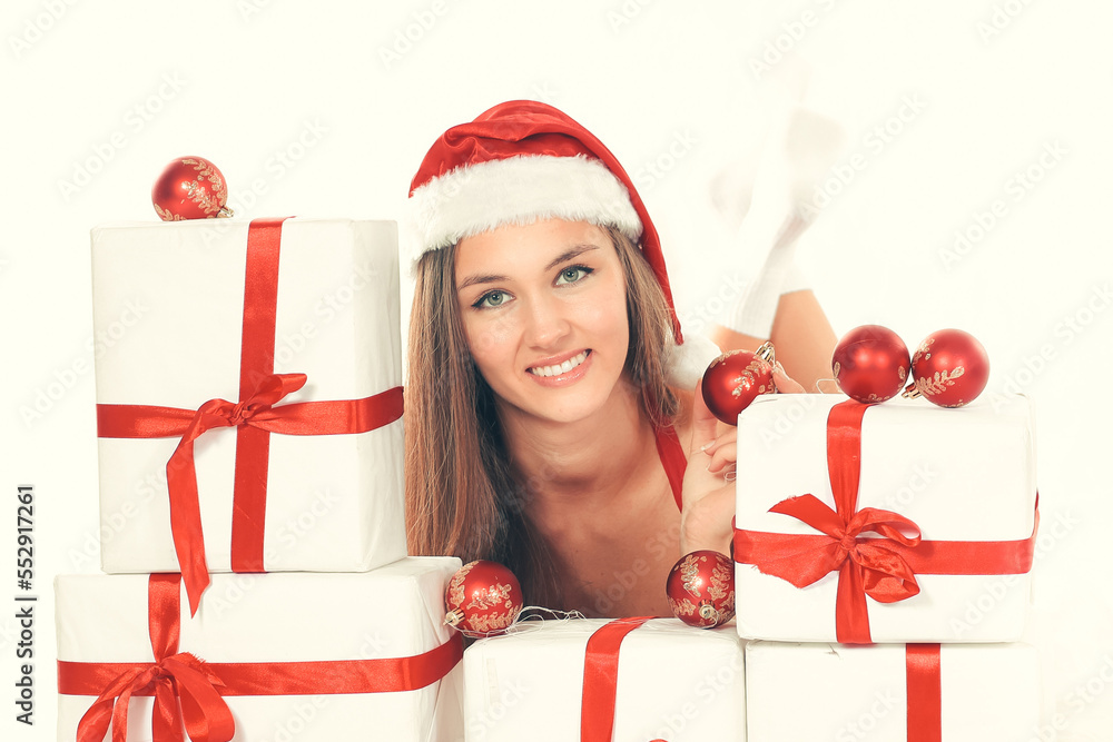 beautiful young woman in Christmas suit with a stack of Christmas gifts.