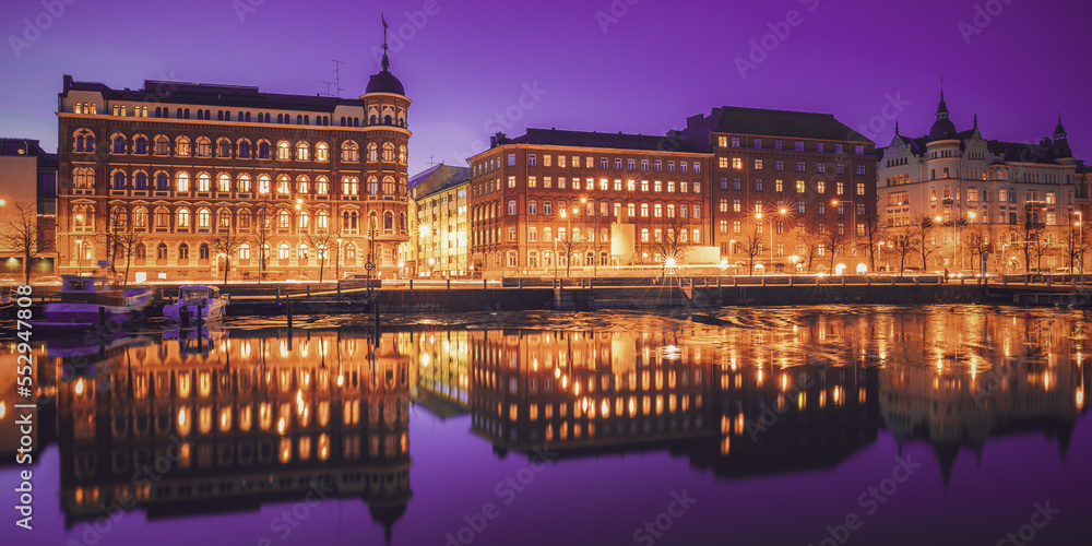 Helsinki, Finland. Very Peri Starry Sky. View Of Pohjoisranta Street In Evening Or Night Illumination. Bright Dramatic Light Purple Sky.