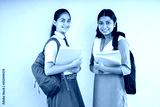 Happy Rural and Modern Indian student schoolgirls wearing school uniform holding books and bag standing together isolated over beige background, Studio shot, Education concept.
