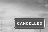 Green color transportation sign with word cancelled on blue sky with white cloud background