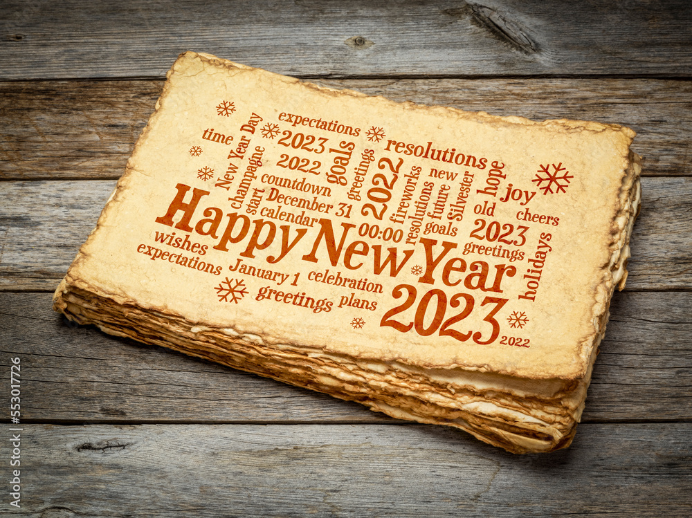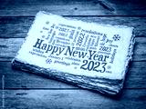 Happy New Year 2023 greetings card - word cloud on a retro handmade paper