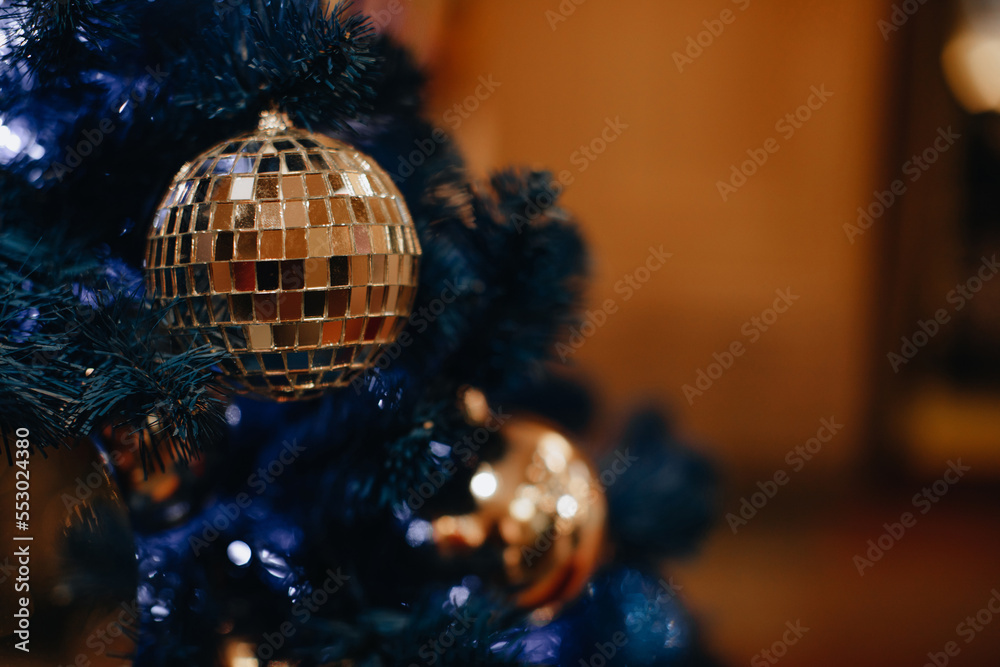 Golden Christmas balls hanging on the blue Christmas tree. Bokeh magic effect. Festive winter holiday background