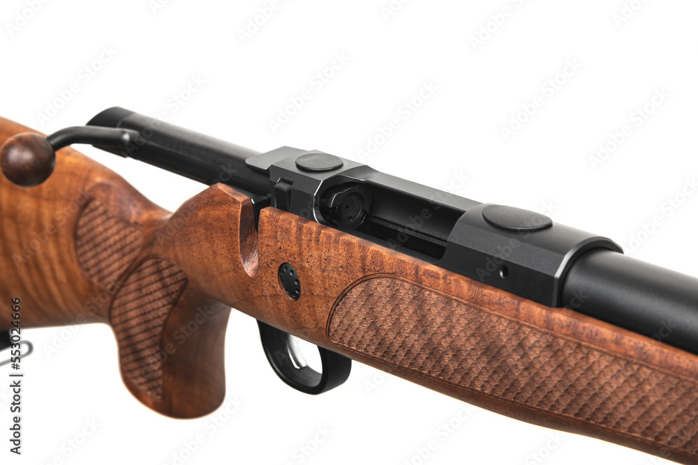 Modern bolt-action carbine with a wooden stock. Weapons for sports, hunting and self-defense. Isolate on a white back.