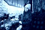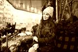 young woman sitting on a bench with a plaid plaid and smiling against the backdrop of a family decor