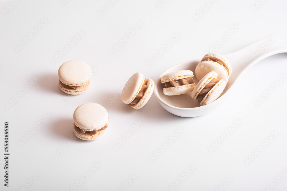 Tasty almond macarons in ceramic white spoon on white background. Copy space