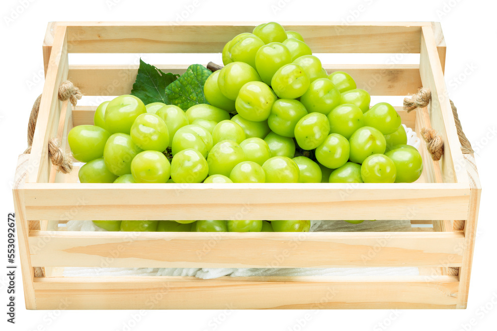 Sweet Green grape with leaves in wooden box, Shine Muscat Grape on white PNG file.