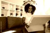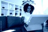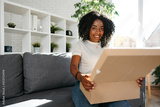 Young african woman sit on couch at home unpacking parcel cardboard box with online purchase