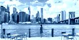 New York city Manhattan skyline seen from Brooklyn waterfront - woman looking at view. American people walking enjoying view of Manhattan over the Hudson river from the Brooklyn side. NYC cityscape