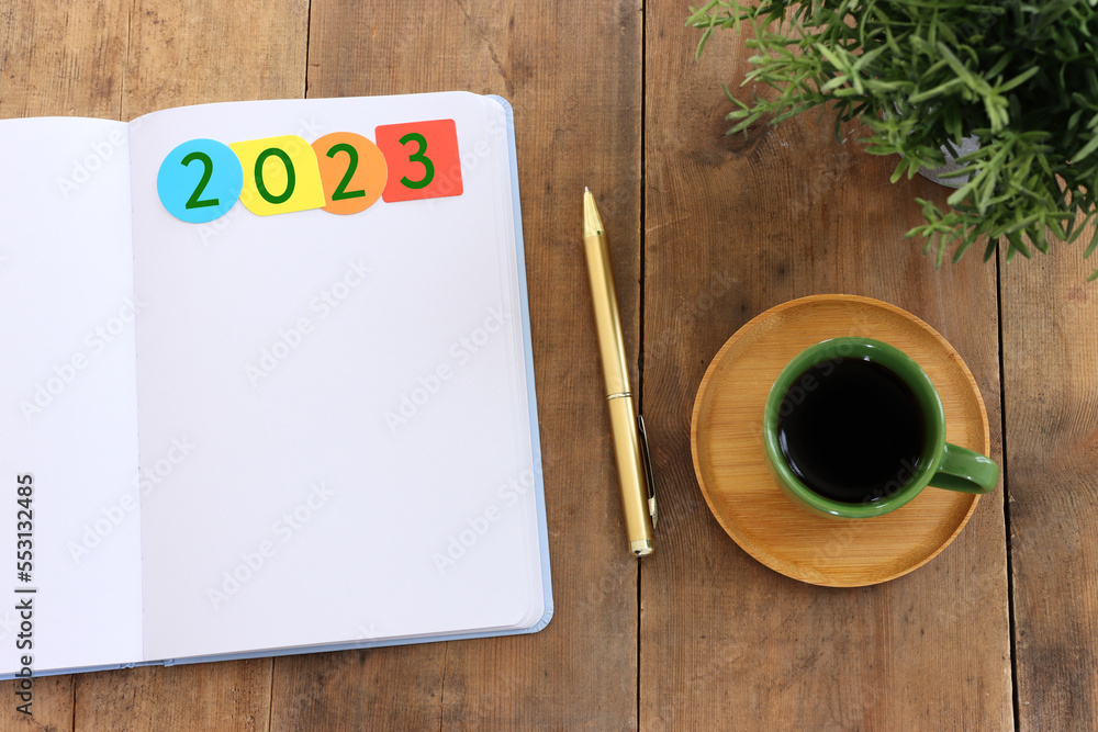 Business concept of top view 2023 goals with notebook, cup of coffee over wooden desk