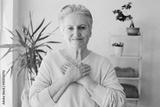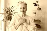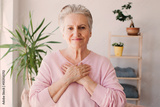 happy adult female volunteer holding folded hands on chest