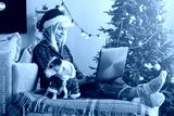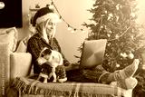 middle aged woman reading a Christmas message on her laptop computer at home