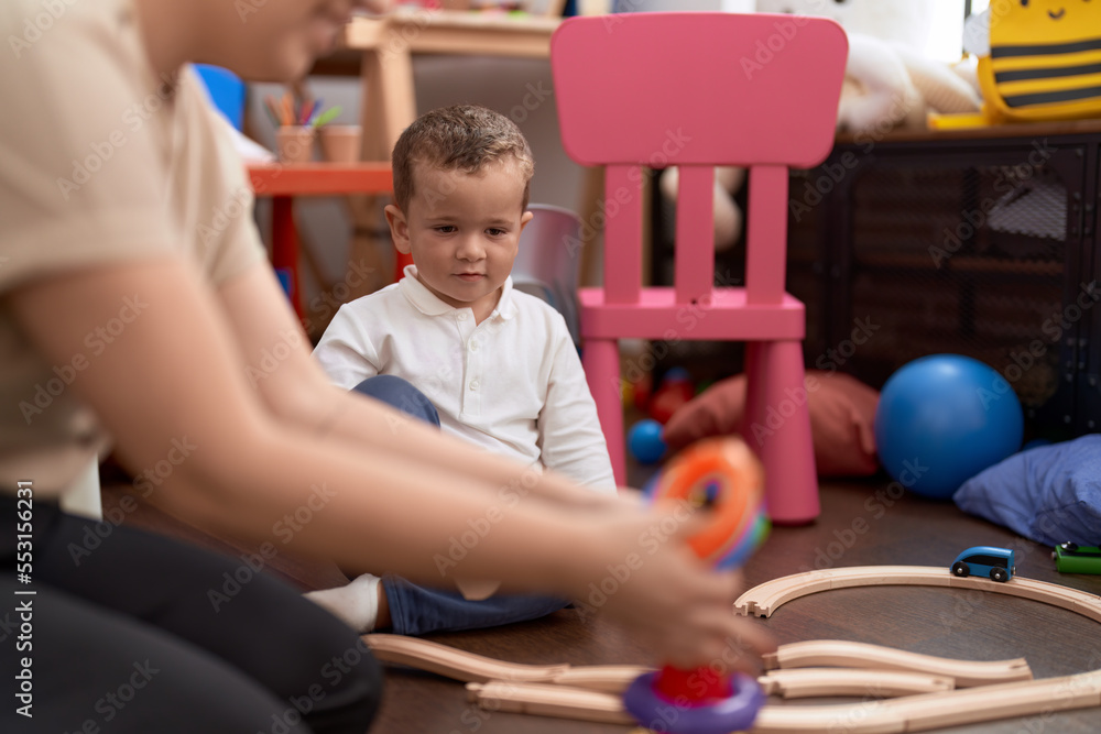 Adorable toddler sitting on floor with relaxed expression at kindergarten