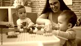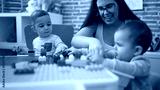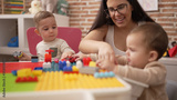 Teacher and preschool students playing with construction blocks sitting on table at kindergarten