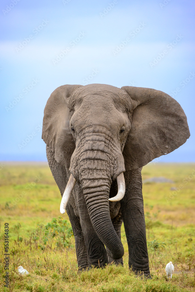 African bush elephant or African Elephant (Loxodonta africana) and cattle egret (Bubulcus ibis). Amboseli National Park. Kenya.
