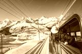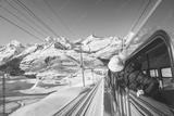 Happy woman traveler looks out from window traveling by train in beautiful winter mountains, Travel concept.