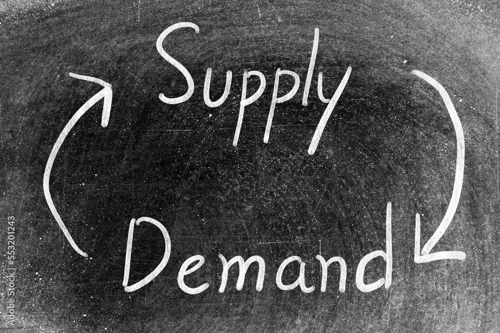 White chalk hand writing in word supply demand and arrow shape show as cycle on blackboard background