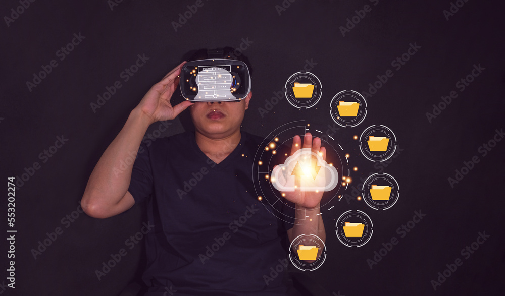Man wearing VR virtual reality glasses, managing documents online, high performance Global Internet connection Online Document Security Database system Automatic file management future technology