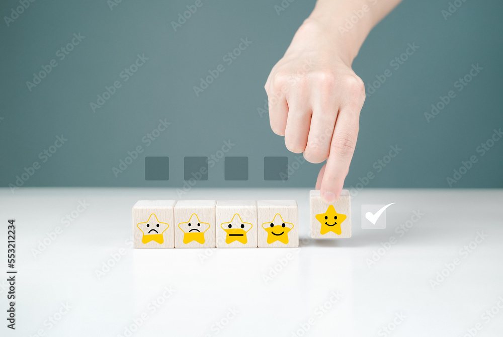 Positive customer reviews experience, wooden blocks with star icons to provide satisfaction, service above expectations, concept, feedback rating and service and satisfaction opt in service