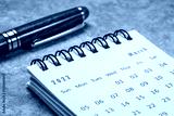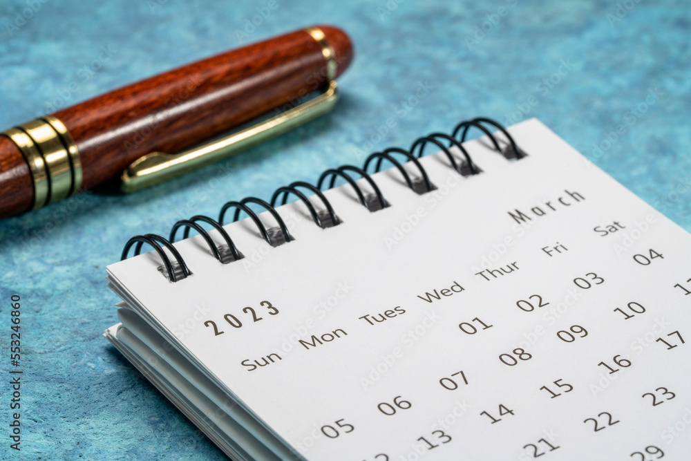March 2023 - small spiral desktop calendar with a stylish pen against textured paper, time and business concept
