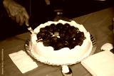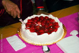 strawberry and cream tart being cut into pieces with a sharp knife