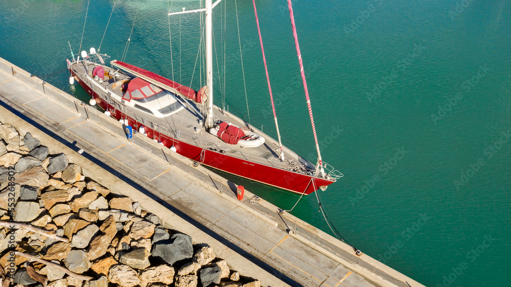 Aerial view on a red and white sailboat. The boat is empty and anchored at the dock.