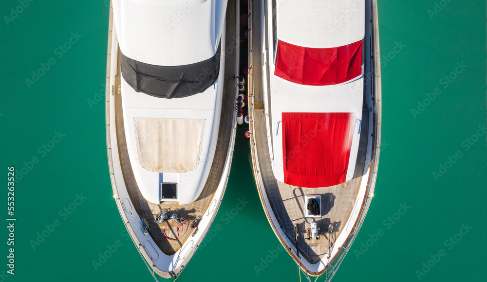 Aerial view of two yachts side by side in port. No one is on board and the boat is anchored in the harbor