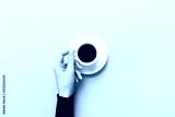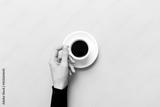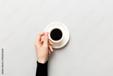 Minimalistic style woman hand holding a cup of coffee on Colored background. Flat lay, top view espresso cup. Empty place for text, copy space. Coffee addiction. Top view, flat lay