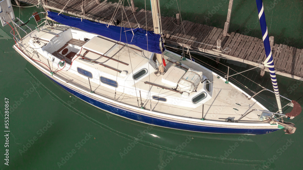 Aerial view on a blue and white sailboat. The boat is empty and anchored at the dock.