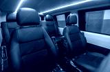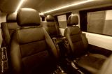 comfortable passenger bus interior with upholstered seats; individual transfer for a group of people; conversion of the interior of a truck;